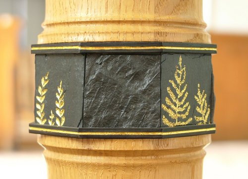 Der achteckige Sockel besteht aus Elmkalkstein, so wie er auch als Baumaterial für unsere Kirche verwendet wurde. Das Holz einer ca. 300 Jahre alten Eiche für den Korpus des Leuchters stammt ebenfalls aus unserer Gemeinde.