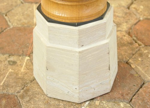 Der achteckige Sockel besteht aus Elmkalkstein, so wie er auch als Baumaterial für unsere Kirche verwendet wurde. Das Holz einer ca. 300 Jahre alten Eiche für den Korpus des Leuchters stammt ebenfalls aus unserer Gemeinde.