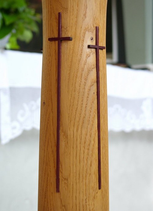 Drei Kreuze sind als unsymmetrische Intarsie eingelegt.
